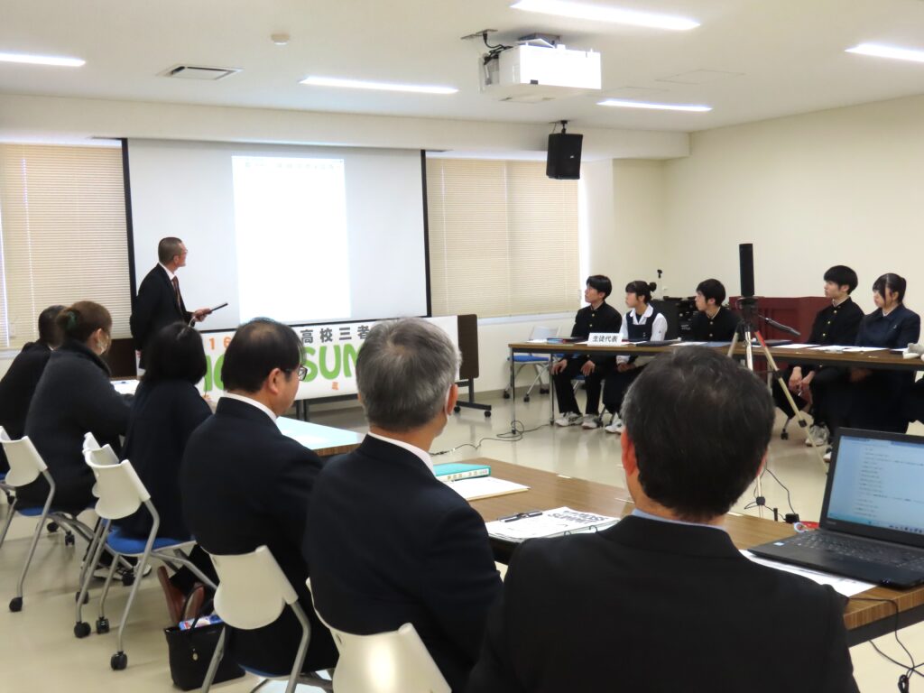この日の参加者は各代表の生徒9名、保護者4名、教職員3名の計16人で、司会も三者から各1名、そして助言者として岩手大学教育学部の田代教授も参加。岩手大学教育学部ではこの取り組みを研究課題としており、この日の模様の一部はzoomで教育学部へ中継されました。